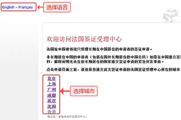 语言选择完之后,接着选择递交此次签证申请的法国签证受理中心所在的城市。法国在中国以下城市设有领事馆和签证受理中心:北京、上海、广州、成都、武汉、沈阳。在香港设有法国领事馆,但是目前尚未开设签证中心。