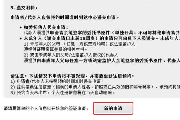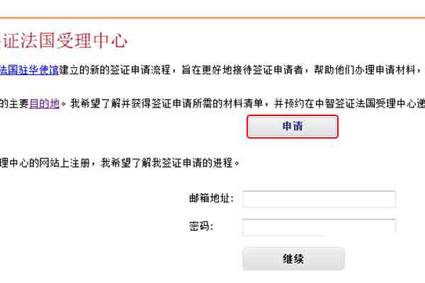 选择城市点击进入后,跳转至申请页面,每位申请人在申请签证之前都需要注册一个新的账户。选择“申请”来完成账户注册。