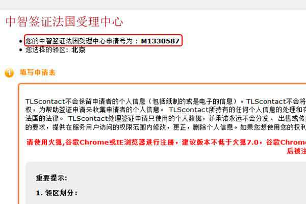 登陆申请表页面之后,系统会自动生成一个法国受理中心申请号。在申请签证过程中遇到任何问题都需提供此申请号,比如:电话咨询;或者需要修改/取消自己的预约时间等。