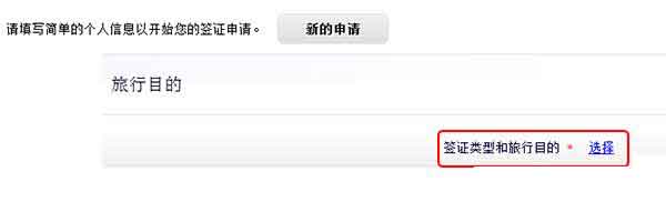点击“新的申请”后弹出表格填写内容。在填写申请表信息之前,首先需要先选择签证类型和旅行目的。