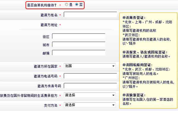 *为必填项;其他可填可不填;工作电话必须在电话号码前加+86;申请旅游签证时,在填写到“是否由某机构接待”时,应该选择“否”,然后在邀请方信息里面直接填写在法国入住的第一家酒店的信息。