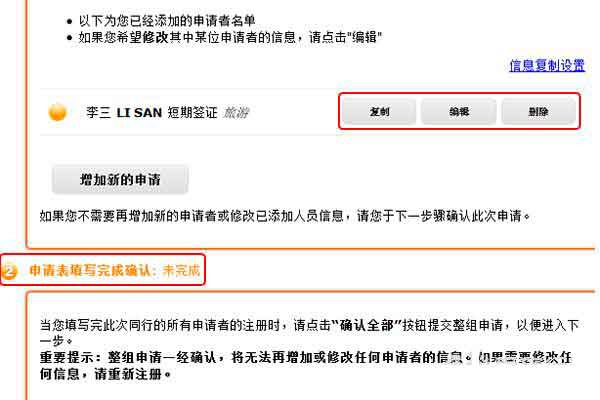 如果此次出行不止你一个人,那么你可以点击“增加新申请”,添加同行人的信息。请注意:如果你和家人(父母,配偶,孩子)同行, 则所有人必须申请在同一组。