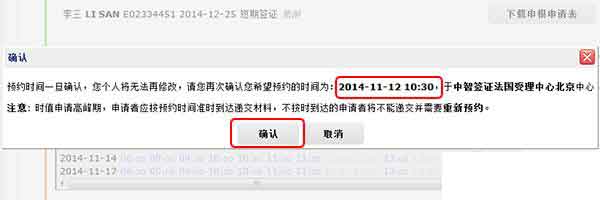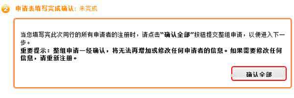 在所有的信息都确认无误之后,点击“确认全部”,进入最后一步“预约时间”。请注意:申请信息一经确认,将无法再增加或修改任何申请者的信息。如果需要修改任何信息,只能重新注册。