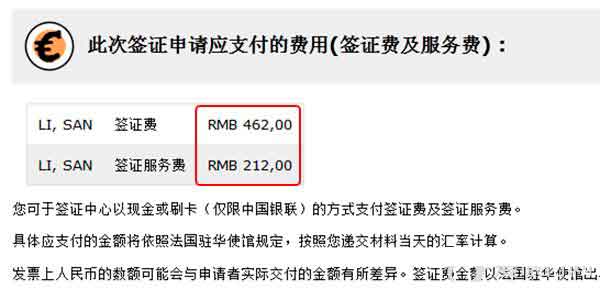 你可于签证中心以现金或刷卡(仅限中国银联)的方式支付签证费及签证服务费;发票上人民币的数额可能会与申请者实际交付的金额有所差异,签证费金额以法国驻华使馆出具的发票上的欧元数额为准。