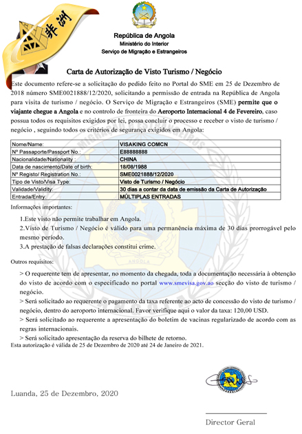 受理使馆:安哥拉移民局